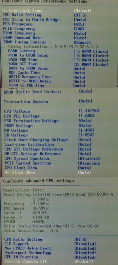Ich habe die relevanten Einstellungen im BIOS fotografiert und angehangen. Alle Einstellungen bis auf VCore sind wie auf den Bildern. Die PLL, NB und SB Spannungen habe ich so eingestellt, weil ich irgendwo gelesen habe, dass die P5K's einen Bug haben wo sie bei niedriger eingestellen Temperaturen mehr Spannung geben und damit Schaden anrichten könnten.