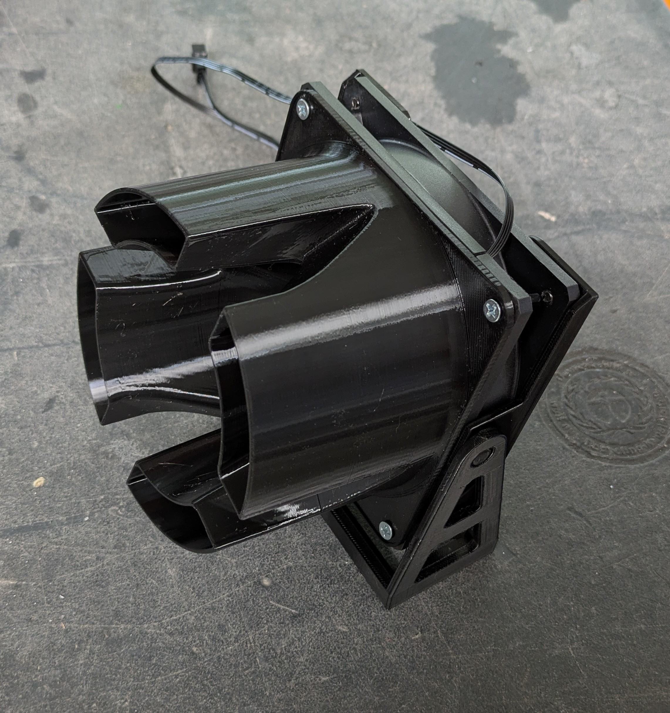 Lüfter sind Arctic P12 PWM PST. Noctua-Vorsatz/Trichter, Halterung und Fuß für den Lüfter via 3D Druck (Fuß und Halterung selbst entworfen).