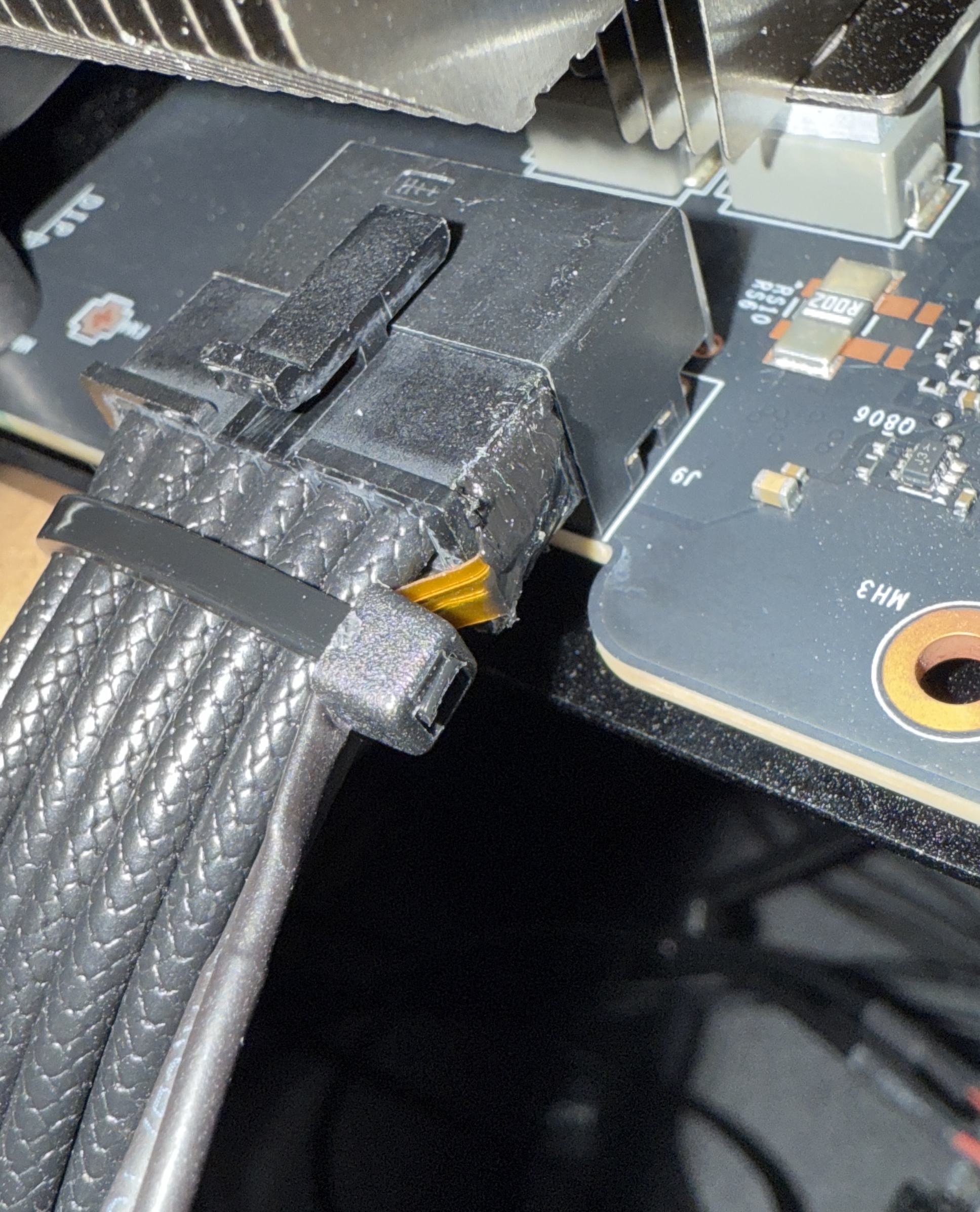 Ich empfehle dir dringend den Kabelbinder entweder zu entfernen oder 4...5cm weiter weg vom Stecker zu platzieren! So macht er es nur schlimmer! Vielleicht finde ich noch den Verweis aus der Spec, dass da auf keinen Fall ein Kabelbinder oder ähnliches so kurz hinter den Stecker darf!