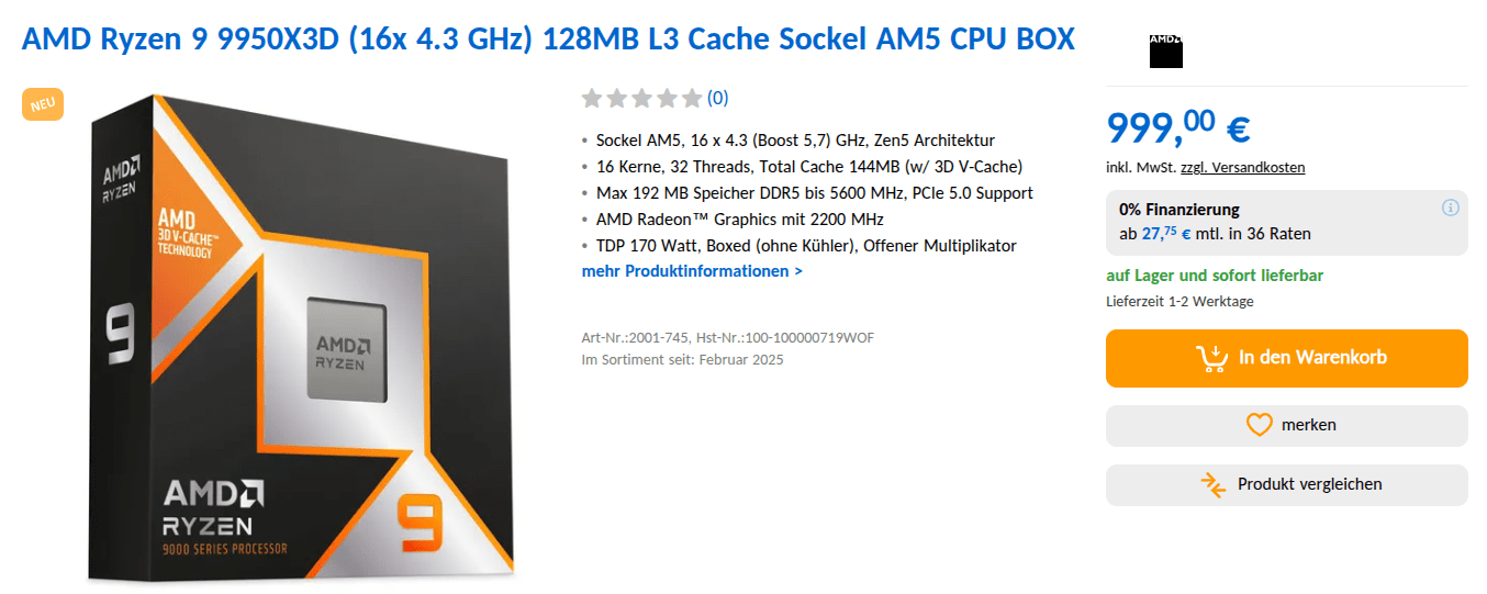 Hab mir auch den Amazon 9950X3D für 744 € gegönnt und den 799 € teuren von Proshop storniert :)