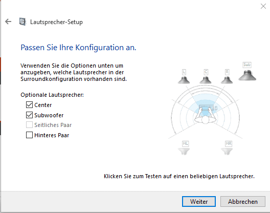 da ich derzeit nur 3.1 Boxen eines 5.1 Systems aufstellen kann, wollte ich dieses Setup unter Windows 10 konfigurieren.