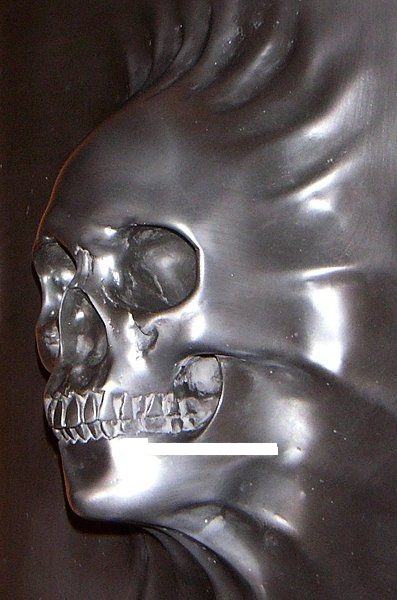 Also quasi ein Schädel der aussehen soll als wäre dieser aus Metall und würde aus der Box hervortreten.