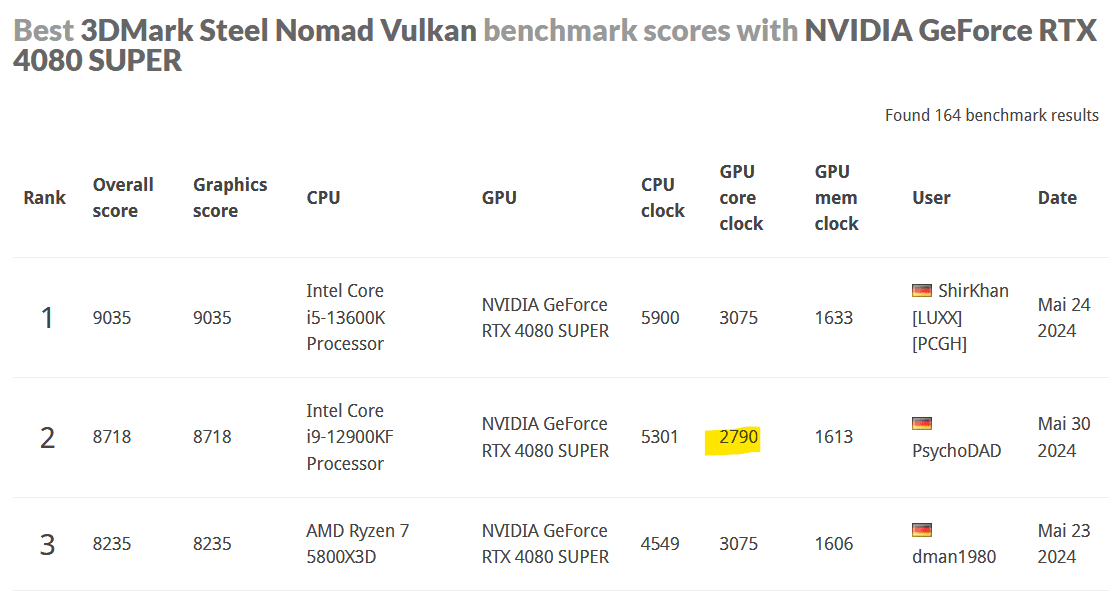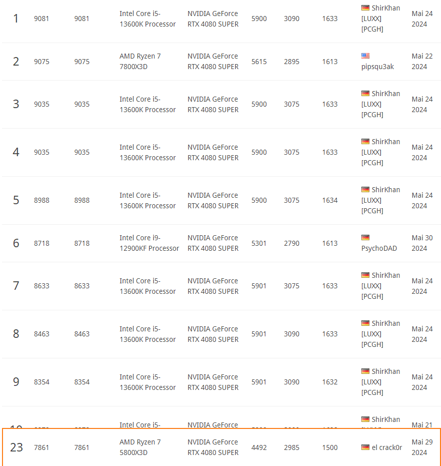 Du könntest mal deine alten Ergebnisse im 3DMark löschen. Wenn man auf der Webseite nach 4080 Super Ergebnissen schaut, sieht das so hier aus: