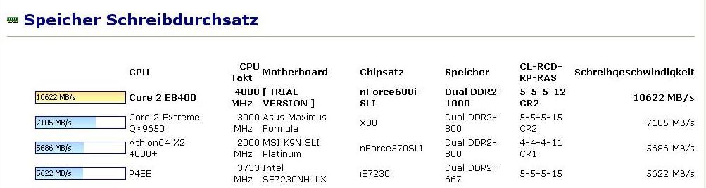 CPU CPU Takt Motherboard Chipsatz Speicher CL-RCD-RP-RAS Schreibgeschwindigkeit