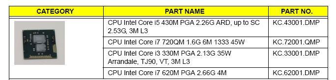Intel i3 330M; Intel i5 430M; Intel i7 620M/40; Intel i7 720QM