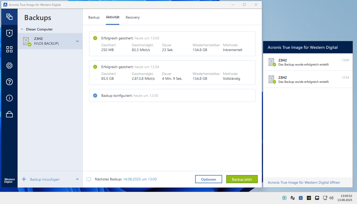 - Sicherungsart: tägliches, inkrementielles Backup um 13:00 Uhr.