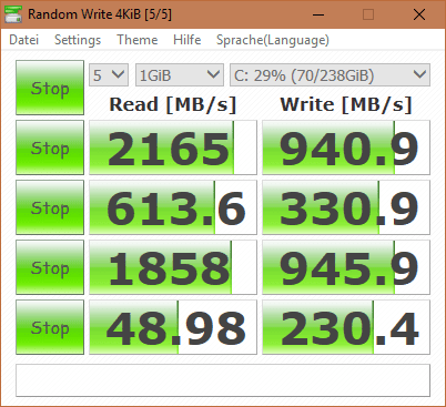 Nur eben die NVMe SSD nicht. In den 4K Read Werten ist sie sehr schlecht und laut dem Samsung Magican liegen die random read IOPS unter der Hälfte des zu erwartenden Wertes. Sequentielles Lesen und Schreiben ist alles gut, auch random write IOPS sind okay.