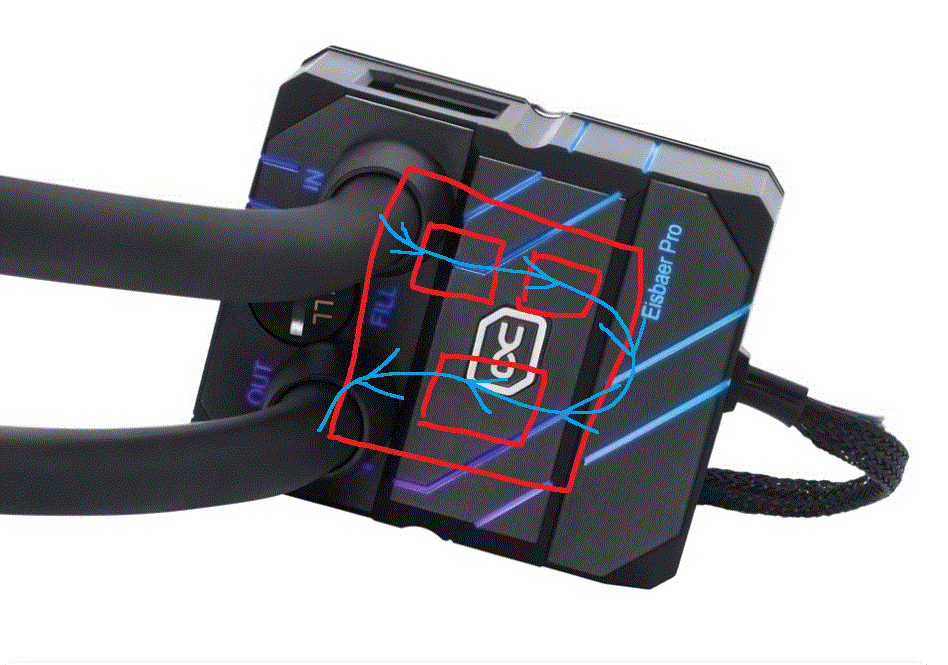 Der IN befindet sich rechts am Block oberhalb der CCDs dann - bzw. zumindest nahe dem CCD 0 denke ich. Das vom Radi hinfließende kühle Wasser wird direkt oder nahezu direkt auf die Fläche mit den Cores drunter gespült und links oberhalb des IO-Dies per OUT wieder abtrasportiert - so in etwa meine ich das zu erkennen.