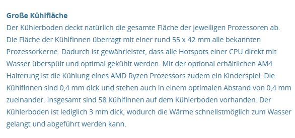 Also den Kommentar verstehe ich nicht - sorry. Die Bodenplatte der AIO ist deutlich größer als der CPU-HS - die Fläche der Bodenplatte ist so groß wie der HS eines Threadrippers. Und im Innern sind von der 79 x 64mm großen Bodenplatte Kühlfinnen auf 55 x 42mm angebracht - das ist schlicht der Oberwahnsinn. D.h. die gesamte CPU-Fläche ist kühlerseitig komplett von Kühlfinnen überdeckt - nicht lediglich von der Bodenplatte mit einem flächenmäßigen Anteil an mit Finnen ausgestatteter Bodenplatte.