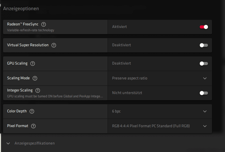 Wenn ich aber im Radeon schaue steht es auf 6bit, ich kann es umstellen, der Bildschirm wird auch kurz schwarz als ob er umschalten würde, dann schaltet es aber einfach auf 6bit zurück.