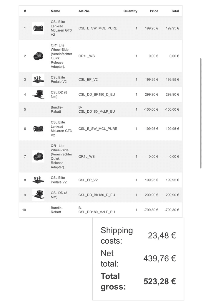 Ich bin noch dran, aber der Fanatec-Support ist momentan aus bekannten Gründen überlastet.Es fehlt nur noch ein rundes Wheel, aber das reicht auch nächstes Jahr.