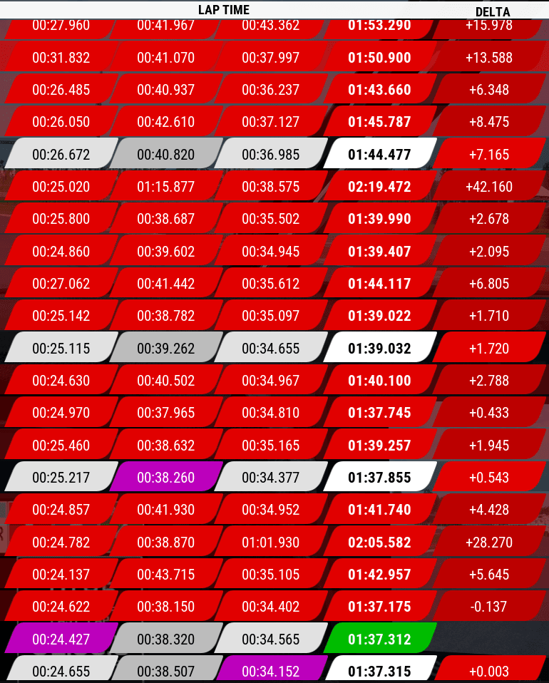 Und danach habe ich wieder 2 Runden versemmelt. 7 valide Runden am Stück unter 01:38.328 Schnitt ... würde ja glatt noch ein paar Stunden investieren und die Herausforderung annehmen, aber erstmal müsste ich eh SA überhaupt auf das Niveau bringen und mit einem 3 Monate alten Baby sehe ich mich in nächster Zeit ohnehin noch kein LFM fahren, sagen wir es mal so😂Ich würde es aber auch begrüßen, wenn es da noch eine Liga unter den "rookies" gäbe. Die Zeiten finde ich schon knackig für Einsteiger. Hat man bloß vermutlich wieder das Problem, dass dann wieder irgendwelche Vollprofi-Hanseln mit emotionalen Problemen dann in so eine Liga begeben und für Twitch Abos Nubs abziehen 🤷♂️