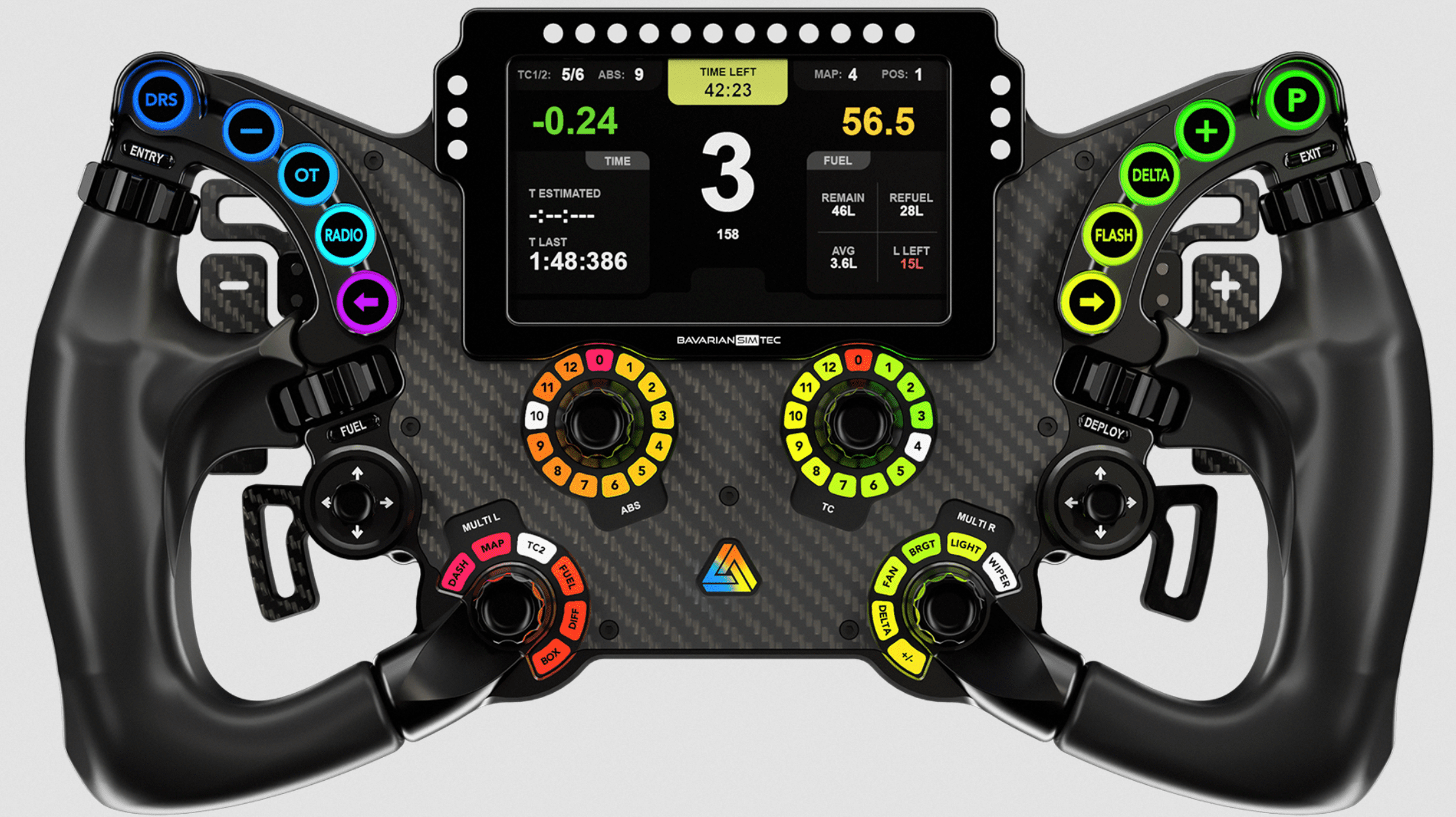 Im Prinzip brauche ich kein Dashboard, aber haben ist bekanntlich besser als brauchen. Ich brauche auch nicht unbedingt ein Lenkrad, aber am Artura Pro stört mich hin und wieder schon, dass keine Rev Lights dran sind und dass die Rotaries nicht beleuchtet sind. Die Rotaries am Artura Pro nutze ich wie die Multifunction Rotaries am Delta, sprich Einstellung auswählen und dann per Tasten oder Thumb Encoder justieren. Besonders fein daran ist, dass man dann halt viele Möglichkeiten hat, um auch abseits des Spiels Einstellungen zu tätigen, also z.B. in Simhub das Ambient Light, die Stärke der Shaker o.a. Im Prinzip habe ich damit so viele Optionen, dass mein Stream Deck meist eher Zierde ist und ich alles Wichtige am Lenkrad habe.