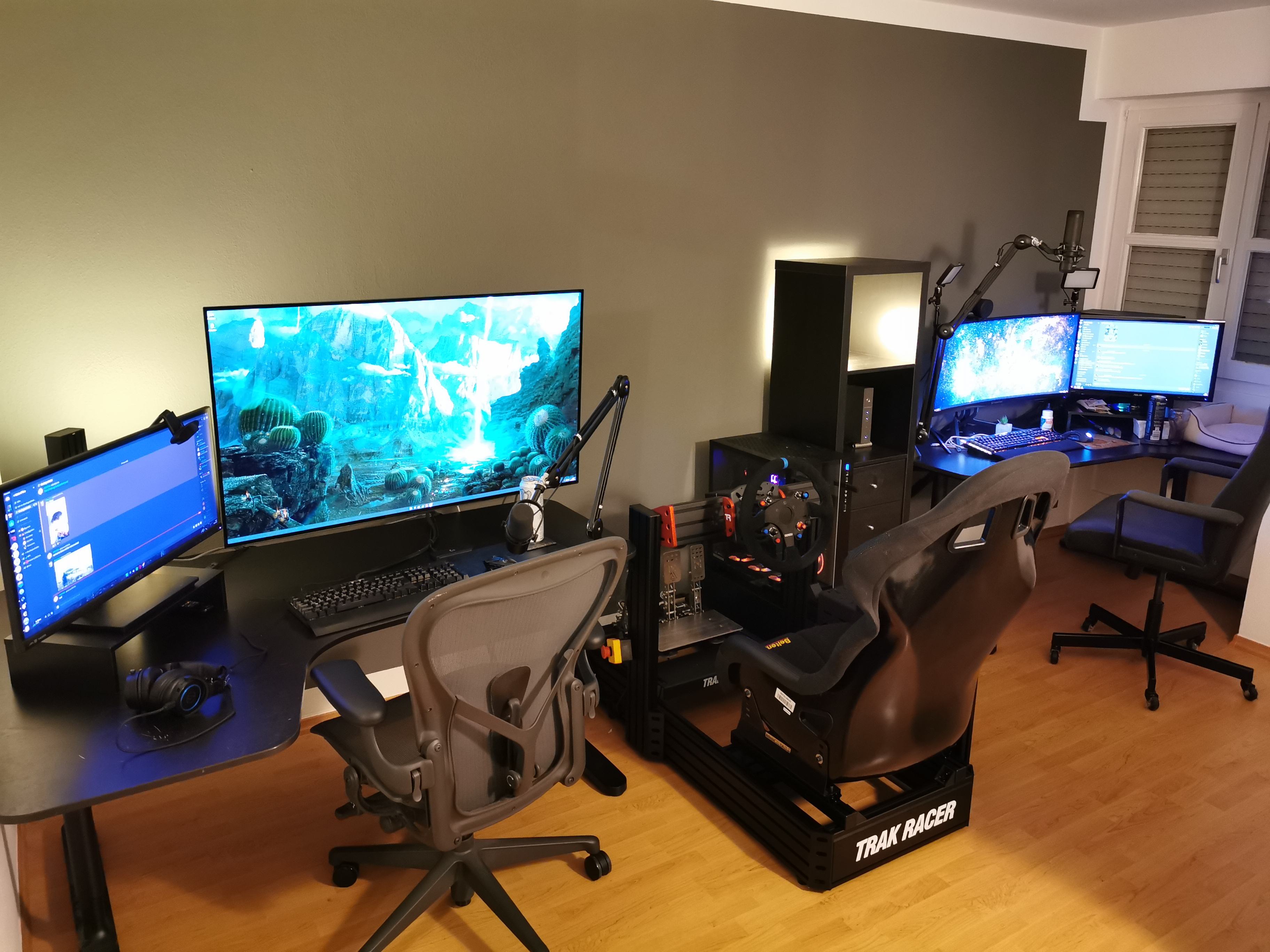 War das hier oder bei Reddit? Da hatte jemand auch sein Rig neben dem Schreibtisch (wie bei dir nur andersherum) und den Monitor mit einer Schiene an der Wand hin und her geschoben. Das fällt mir gerade als mögliche Lösung ein