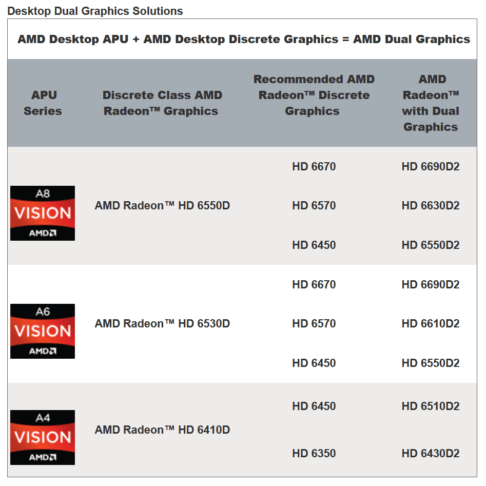 A2: Go to http://www.amd.com/dualgraphics and review the Notebook and Desktop tabs to see the recommended discrete graphics card pairings for your APU.