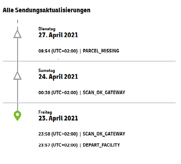 Hat sich erledigt, ist heute angekommen. Ist wohl ein normaler Status bei denen.Gehen wohl so einige Pakete bei denen verloren... (Bestellung vom 16.04.)