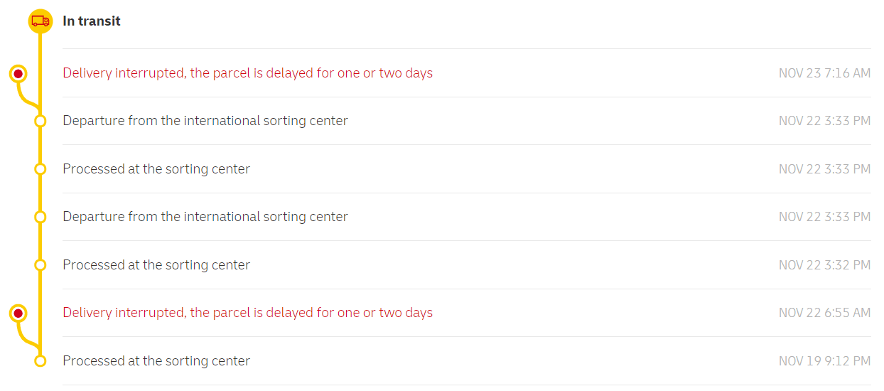 Das habe ich bei ausnahmslos jeder Bestellung im AMD Shop. Insgesamt dauerts bei mir vom Verschicken bis zur Ankunft meist 3-4 Tage.Lieferung unterbrochen, Zustellung des Pakets wird sich um 1 bis 2 Tage verzögern.