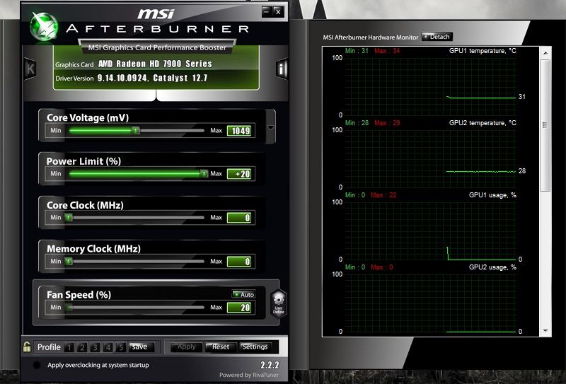Ich hab nen Problem mit dem Afterburner, zur Zeit nutze ich den 12.6 Beta, gleiches Problem habe ich aber auch schon mit den Treibern davor gehabt. Und zwar werden die MHz von Core und Ram im Afterburner mit aktiviertem Unoffical OC bei den Reglern auf 0 gesetzt, ändere ich was, bringt das nichts ausser das die zweite Karte aufeinmal mit 500/1375 MHz im Idle Taktet. Nutze Afterburner 2.2.2, jemand dafür ne Lösung?