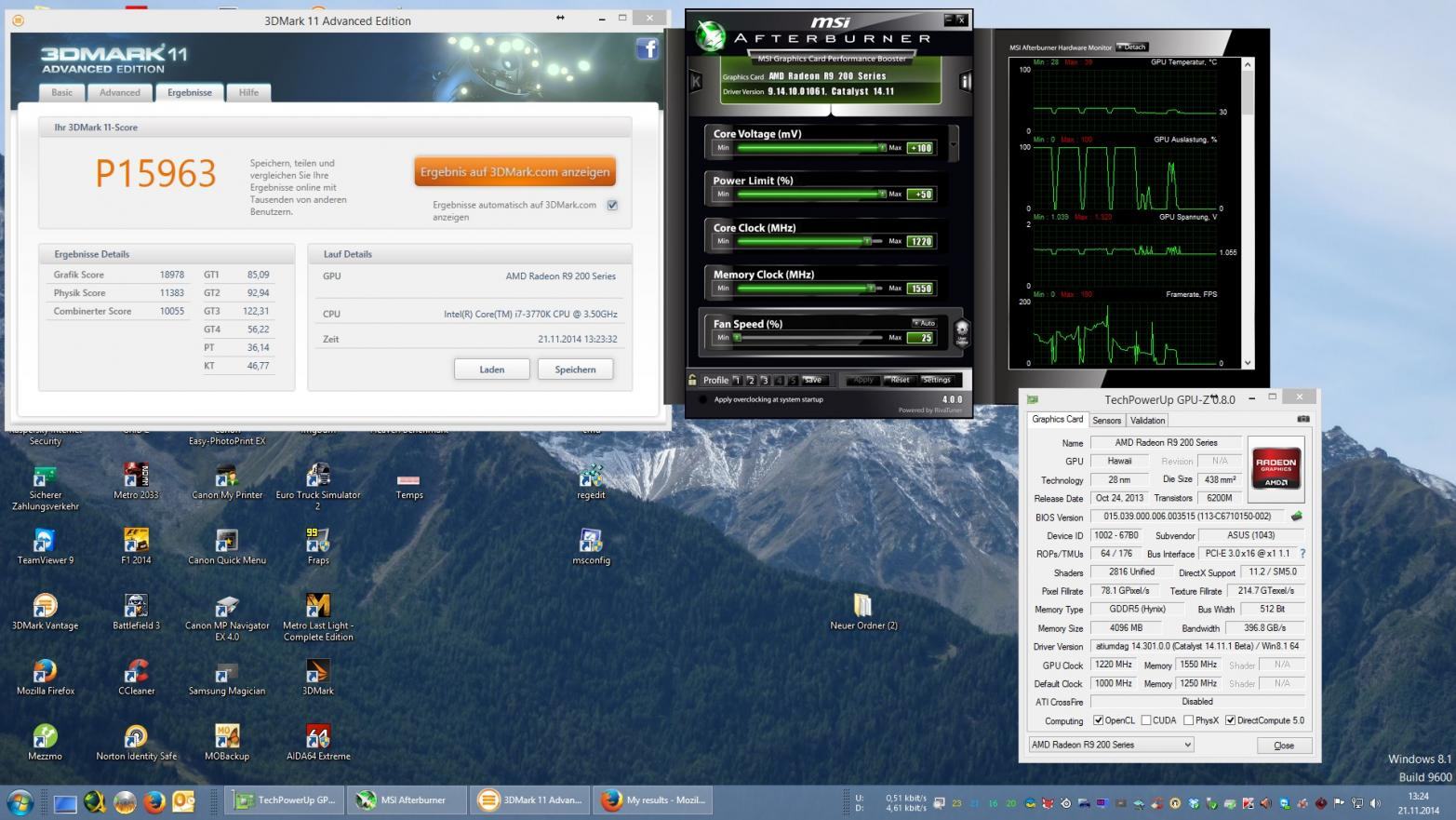 "Zum einen wechselten wir für diesen Versuch vom geschlossenen Gehäuse des Testsystems in einen offenen Aufbau. Zusätzlich haben wir einige Voreinstellungen vorgenommen, wie beispielsweise die Lüfterdrehzahl auf 80 Prozent gesetzt. Damit wird auch klar, dass die Radeon R9 290X bei der Lautstärke kaum zu überhören sein wird, allerdings ging es uns nun darum die maximale Performance aus der Karte heraus zu holen. Letztendlich erreichten wir einen GPU-Takt von 1.100 MHz und einen Speichertakt von 1450 MHz. Dies alles lief gerade so eben stabil bei einer Temperatur von 94 °C. Jede weitere Erhöhung des Taktes sorgte dafür, dass die Karte selbst bei 80 Prozent Drehzahl des Lüfters heruntertaktete."