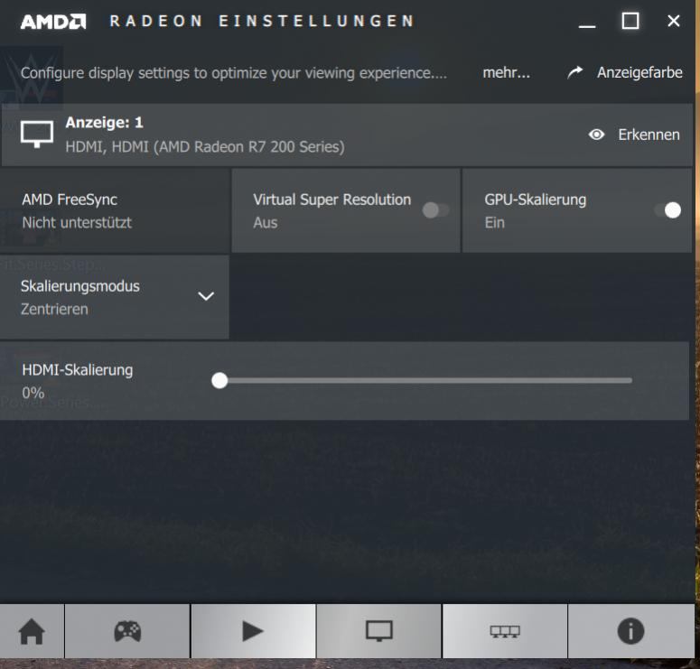 Derzeit werkelt noch eine R7 265x mit HDMI 1.4 im Wohnzimmer-Rechner und 4k kann ich zwar einstellen, aber es werden natürlich aufgrund, dass 1.4 keinen echten 4k-Support hat, nur wenig Bilder pro Sekunde wiedergegeben. Vor allem aber unterstützt die Karte nur bei 1080p HDMI-Skalierung, aber bei 4k ist die Option im Treiber ausgegraut.