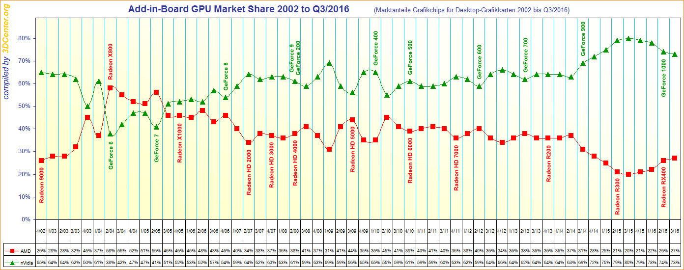 Aber auch bei deinen Zahlen sieht man deutlich dass AMD erst mit Q2/16, also Polaris wieder richtig an Marktanteilen gewinnen konnten, vorher waren sie in einem Tal das schon kaum mehr tiefer hätte sein können.