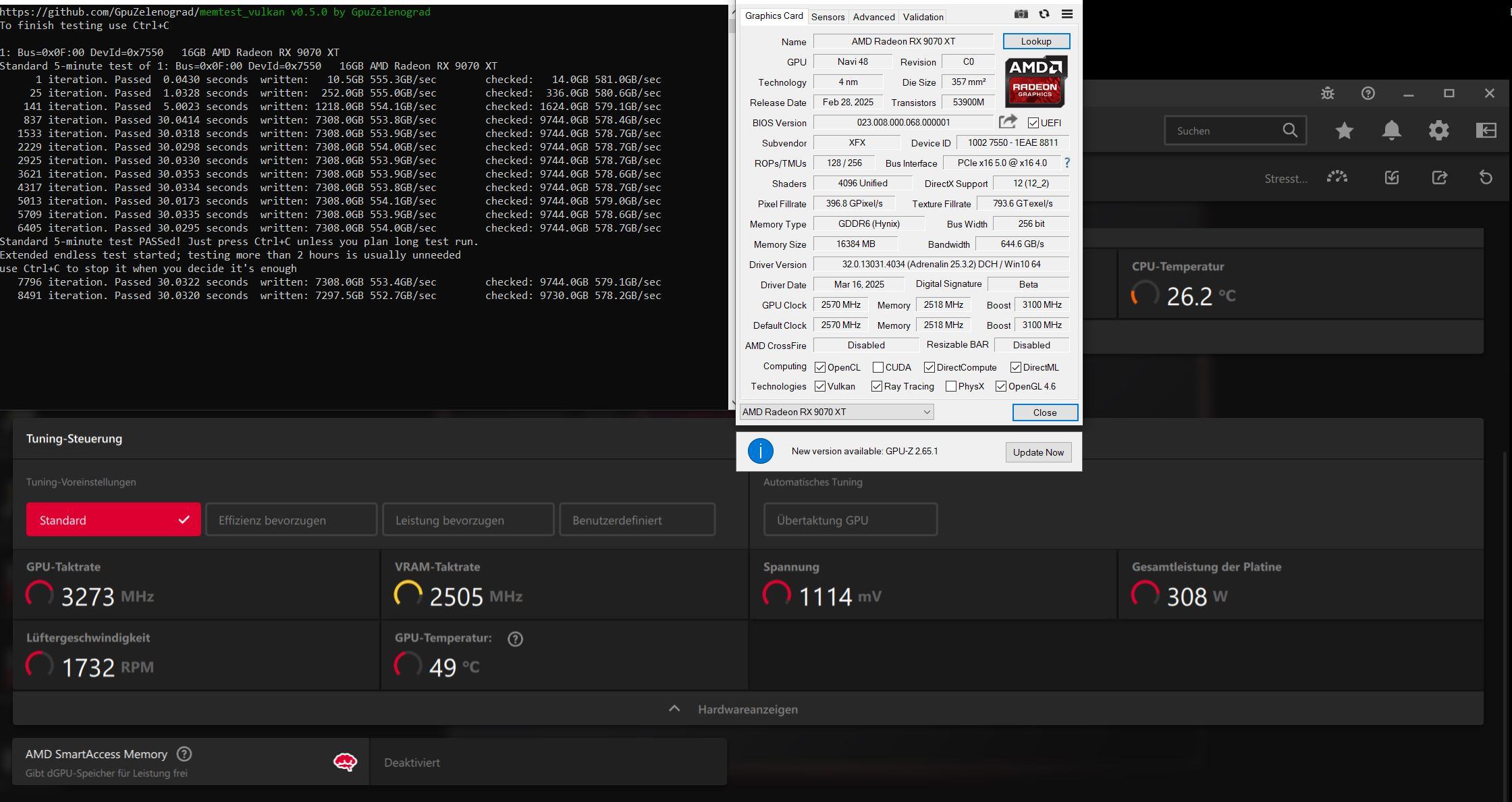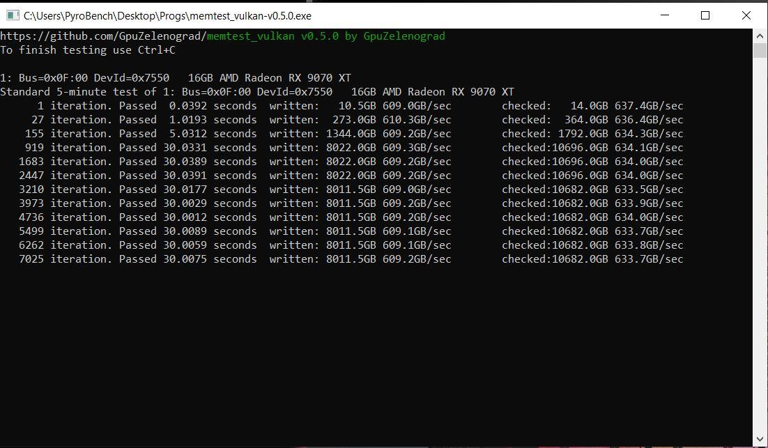 Bei dem Vulkan_Memtest steigt die Performance bei mir nur bis zu einem gewissen Takt. Darüber sinkt die Performance mit jedem 10Mhz-Schritt messbar und reproduzierbar ab, aber es kommt (noch) nicht zu Fehlern. Je höher die Speichertemp (~je länger der Test schon läuft), desto größer der Performance-Abfall in diesem scheinstabilen Bereich. Bei jedem Taktrekord also immer gegentesten, ob es mit 10-20Mhz nicht eventuell schneller wird (d.h. mehr GB/s).