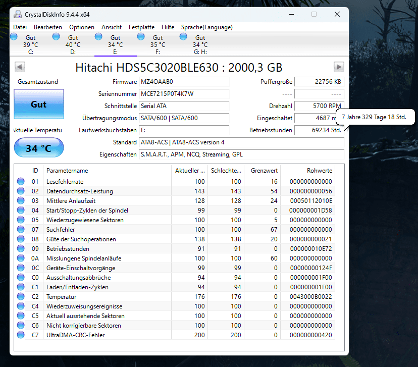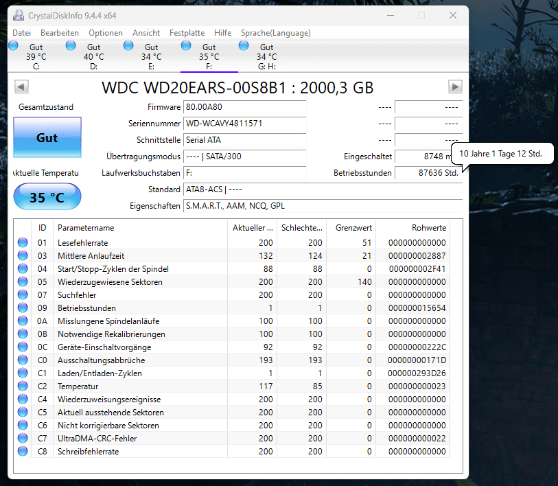 Platten gehen selten kaputt. Hier waren es einzig die Samsung HD502J mit dem SATA3-Selbstzerstörungsbug und eine 1,5 TB 2,5" die ich als 24/7 missbraucht habe und nun die Quittung dafür bekam. Die meisten HDDs werden gelb im Crystaldiskinfo dann sollte man sie langsam auswechseln. Wegwerfen ist trotzdem nicht nötig die kann man zB in irgendeinen alten PC einbauen und als "cold backup" nutzen.Wohlbemerkt Betriebsjahre, nicht das echte Alter der Platten.
