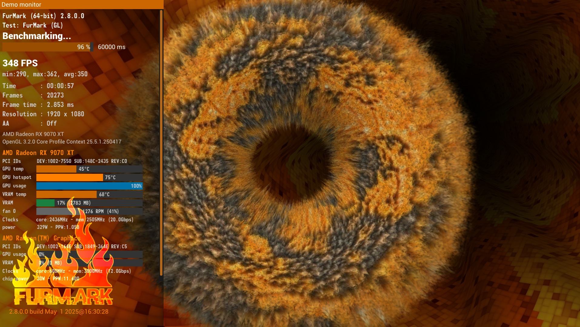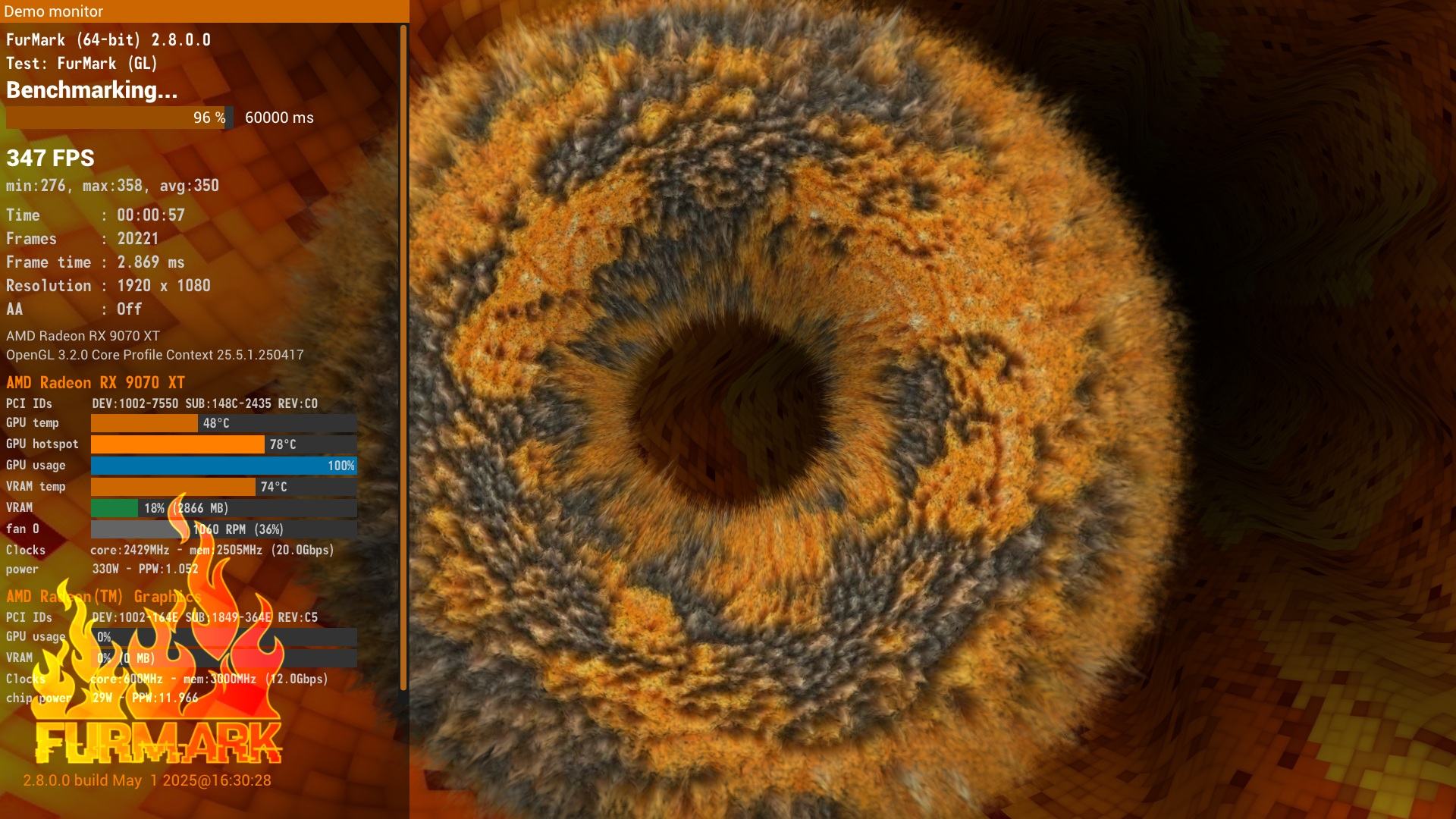 Hier mit Furmark2, da ist es auch zu sehen, aber nicht so dramatisch wie in hwInfo. Aber der Superposition Benchmark in 4k läuft ja länger. Der Test ist jeweils gescreent bei 96% um vergleichbare Laufzeiten zu haben. Normal und Desktop haben einen Unterschied. Achja, Raumtemperatur 17°C.