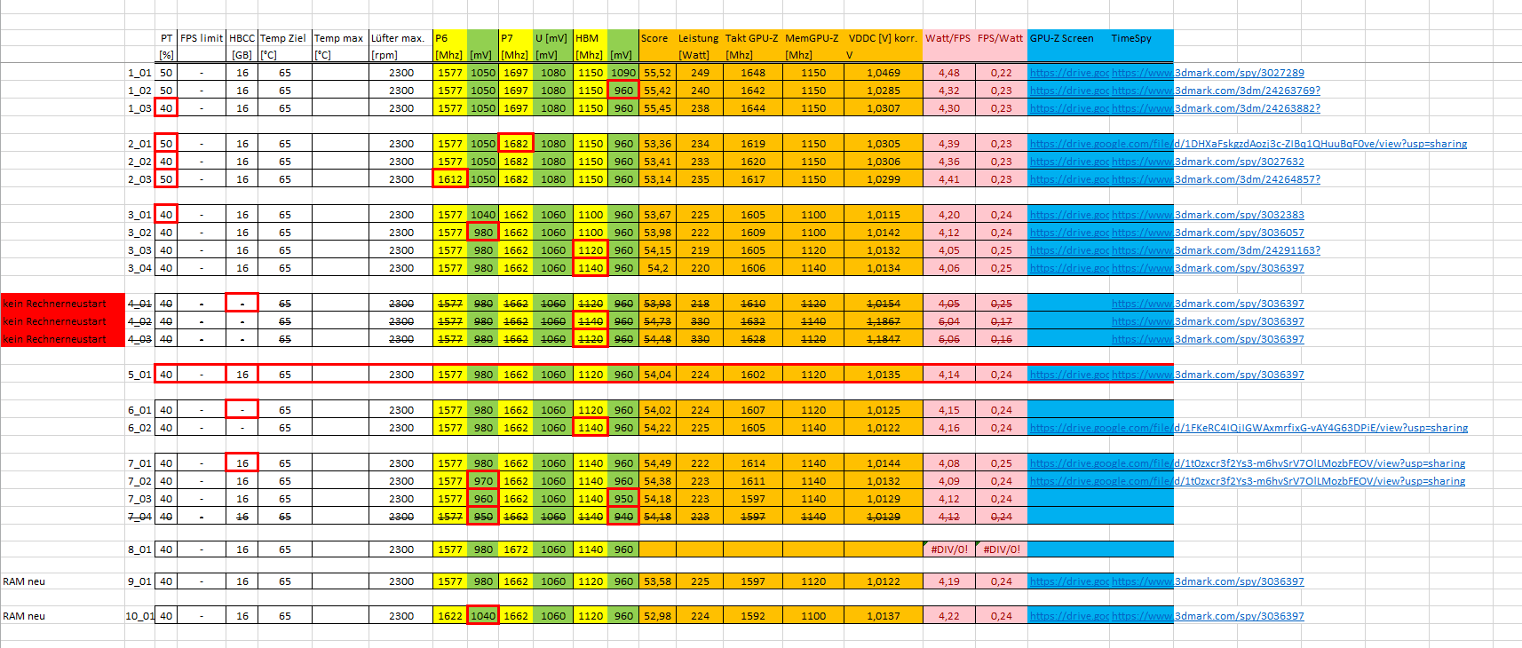 Erst danach den HBM-Takt schrittweise(10MHz) nach oben nehmen, dadurch wird sich nach und nach der effektive Takt reduzieren(stärke Belastung,Temperatur).