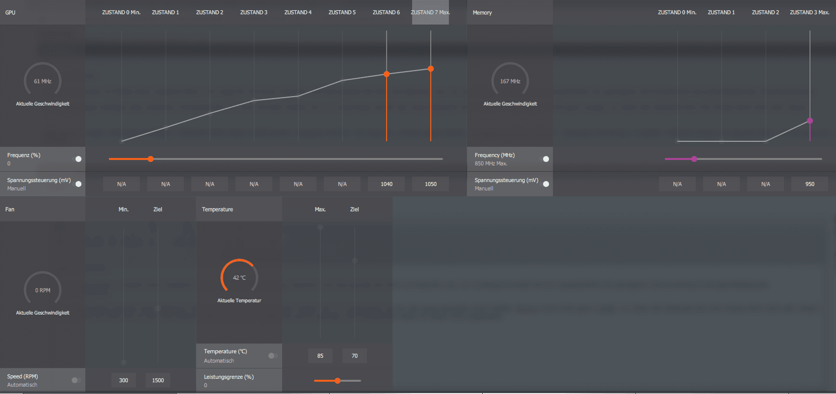 Bisher habe ich mich nur an den GPU-Spannungswerten für die States P6 und P7 gewagt, GPU-Frequenzen habe ich dabei nicht angetastet. Die Speicher-Frequenz habe ich auf 850MHz gesetzt.