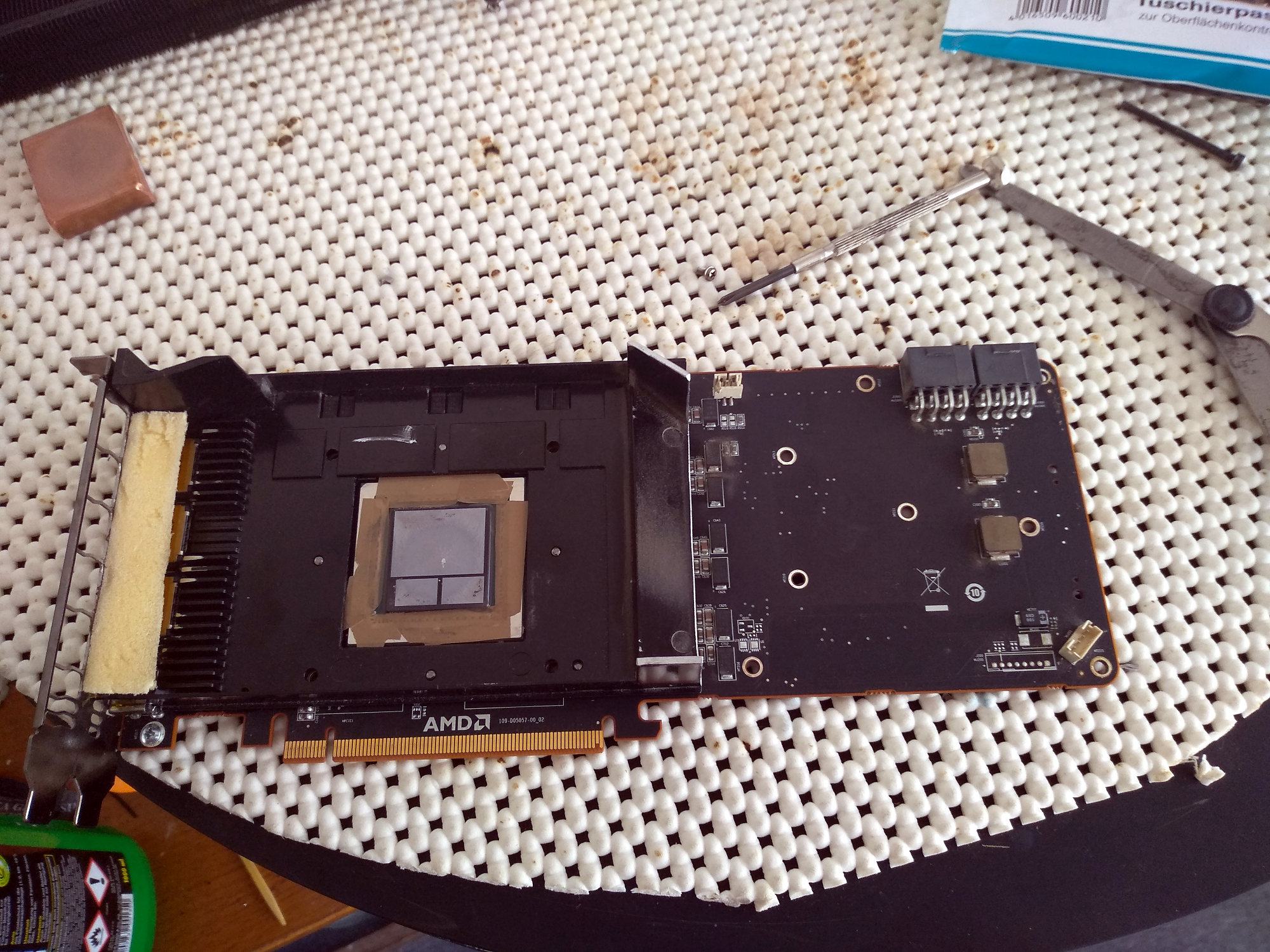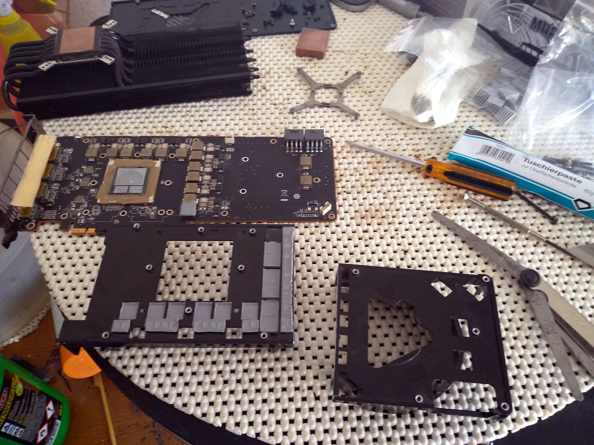 Alternativ könnte man die zu dicken Wärmeleitpads auch mit passenden Kupferspacern ersetzen, ausdistanzieren und mit einer dünnen Schicht WLP finalisieren. Per Vorspannung quetschen ist sicher einfacher, aber sitzt dann das Cover nicht schief zur GPU? Oder ist das auch getrennt?