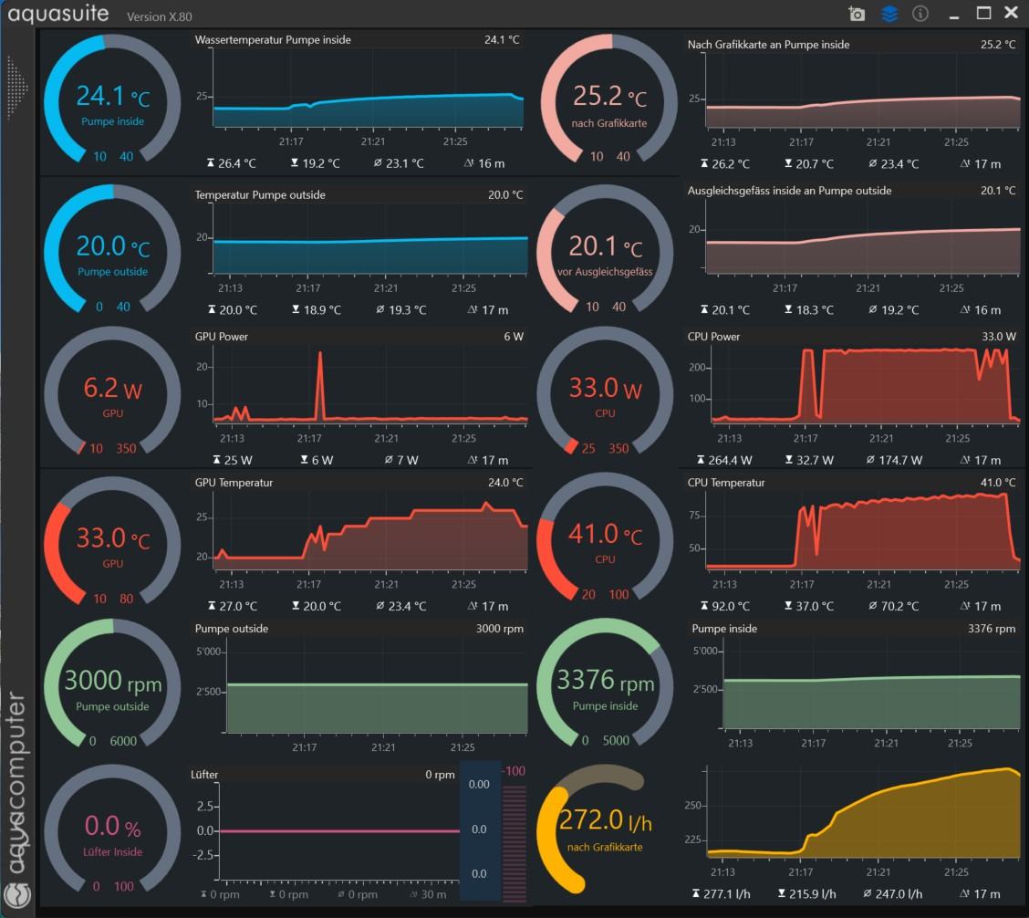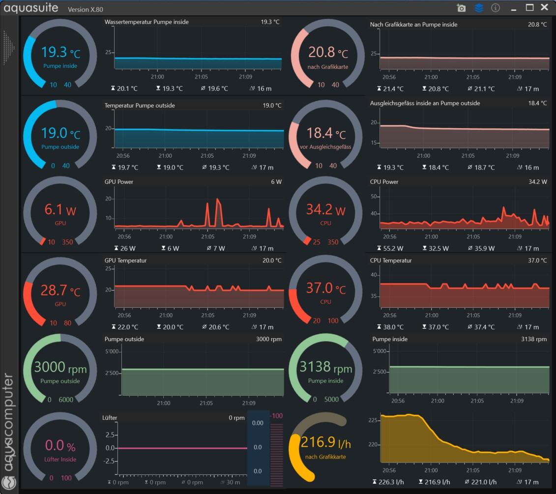 Damit kann ich den übertakteten PC fast lautlos betreiben. Mit der Drehzahl der zweiten Pumpe wird die Temperatur im PC automatisch gesteuert. Sie darf nie unter 10-12 Grad Differenz zur Zimmertemperatur fallen, da sonst Kondenswasser entsteht. Die Ventilatoren des im PC eingebauten Radiators schalten sich nur an heissen Sommertagen zu, wenn der Tank ausserhalb des Hauses nicht mehr kühlen kann. Ich habe mal irgendwo ein Schema gezeichnet und müsste es «ausgraben», wenn Interesse besteht.