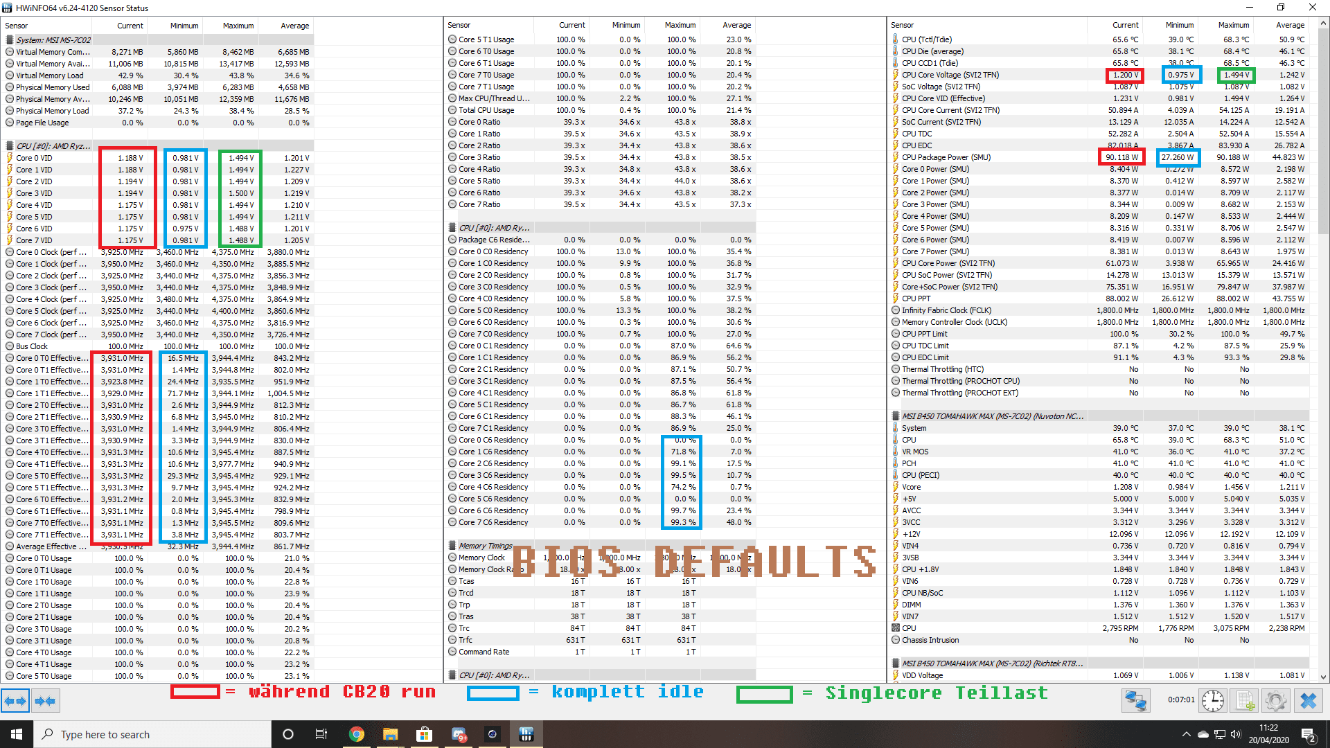 Edit: wenn du mal alle Werte, die irgendwas mit der CPU zu tun haben im Bios auf Bios Defaults setzt, wie sieht dann dein HWInfo Screen während CB20 aus?