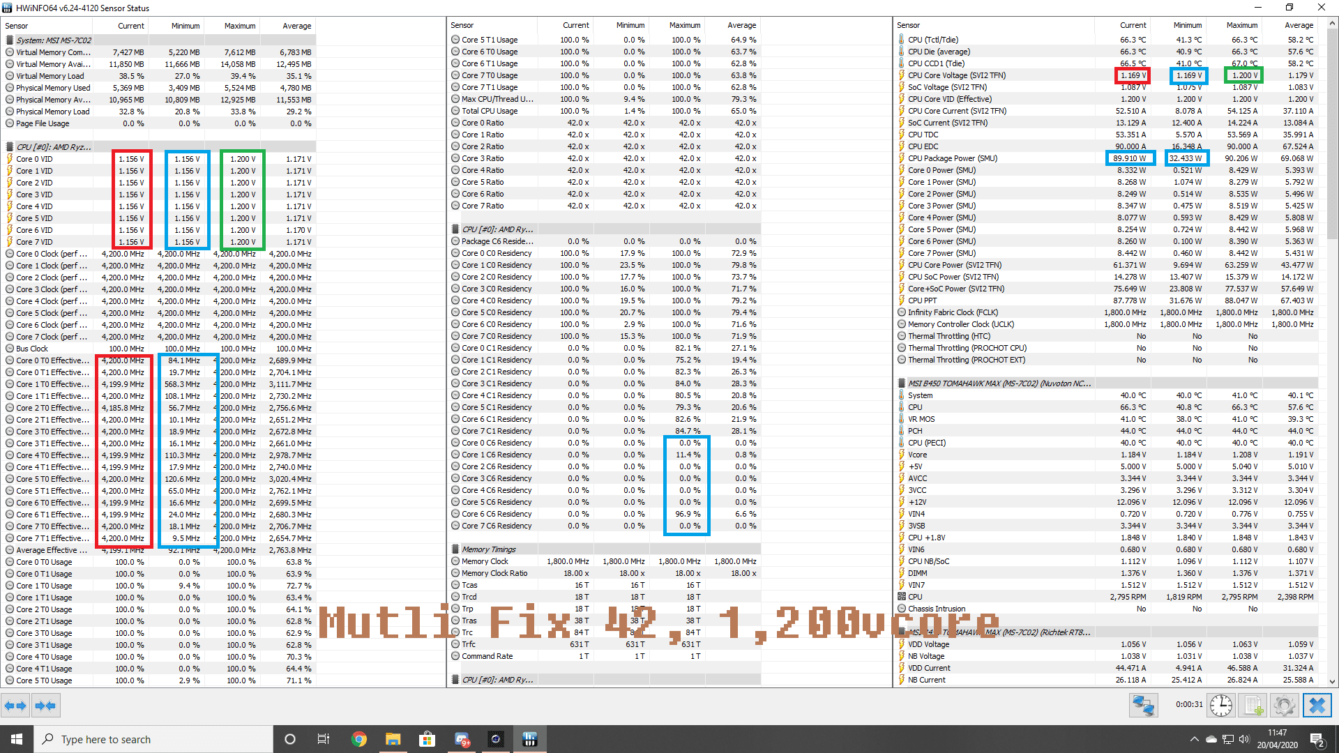 Außer dass dein Idle nicht wirklich Idle ist (4.3% Core Usage) passen die Werte. 4.2GHz während des CB20 MT-Runs sollte wohl der normale Takt für den 3800X sein.