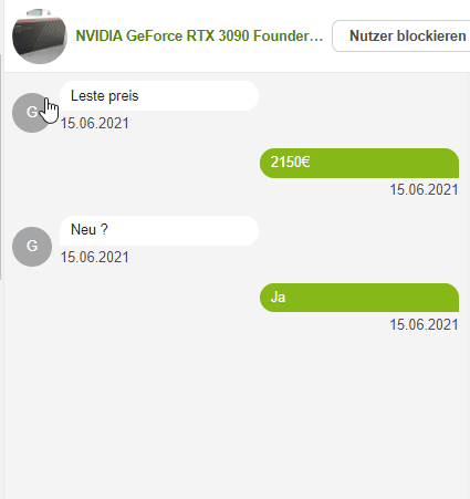 Leste Preis 😂😂😂 der wäre bei mir direkt auf die Blockierliste gelangt. Wenn man es nicht mal hinbekommt seriös unverschämt zu sein 😂Versuche genau das seit Wochen. Mach dich auf mächtig viele Zotac Dual 3070+300-500€ bei EKA gefasst.
