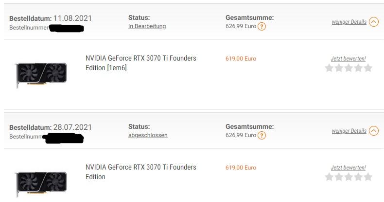 sind auf verschiedenen accounts, aber mit gleicher KK und adresseBei mir hats letztes mal leider nichts gebracht. Erst eine 3090 bestellt, 10 min. später per Email storniert und wurde auch sofort storniert. Später über selben Account eine 3060 TI bestellt und diese wurde später auch storniert.