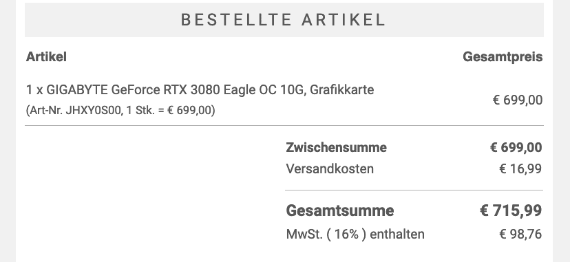 Ja heute Versandmitteilung meiner im September bestellten Strix 3080 non OC bekommenWurde bei jemandem auch eine RTX von Cyberport versendet? Ich habe gestern auf Vorkasse bestellt bei mir im Account ist aber nur "In Bearbeitung" und keine vorraussichtliche Lieferzeit vermerkt.