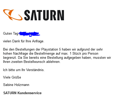 Was für Anfrage meint das Maus? Checken sie, dass man eine bei Mediamarkt und eine bei Saturn bestellt hat? Bei den beiden Shops ist die Konsole noch unter "Meine Käufe" zu sehen.