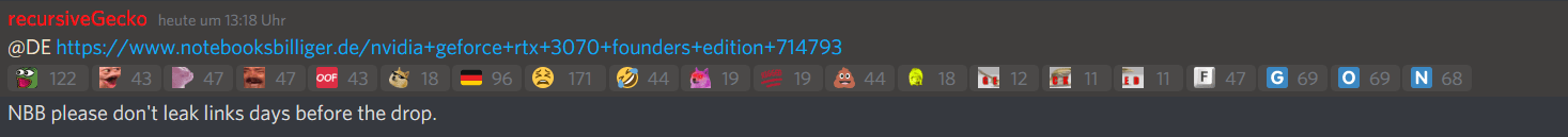 Dann kann man sich denken, dass die anderen Links auch irgendwer hat.Selbst beim Partalert Discord gibt es im Channel der FoundersEdition nur den 3070er Link und nicht mehr.