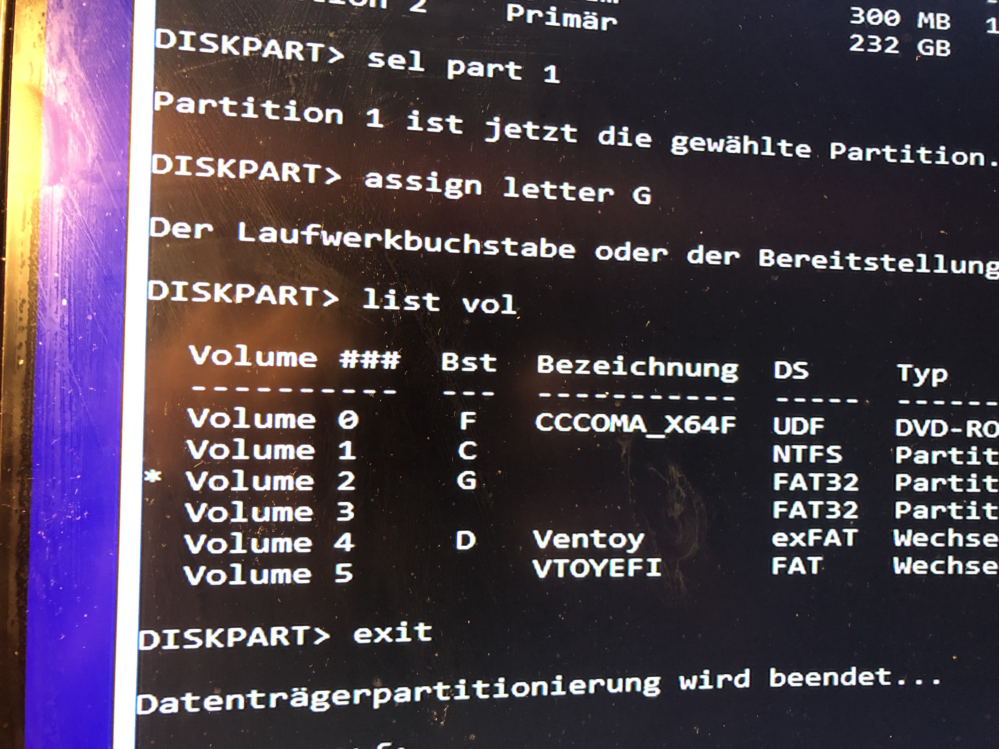 Ich habe in der windows install stick mal mit dem handy ein foto gemacht . Und du siehst ja zb bei mir in den fall ist die windows hauptpartition hat den Buchstabe C meine bootpart hat den Buchstabe g. Und die windows 11 install iso den Buchstabe f. Das bedeutet. du muss erst in den windows install iso stick laufwerk f in meinen fall.