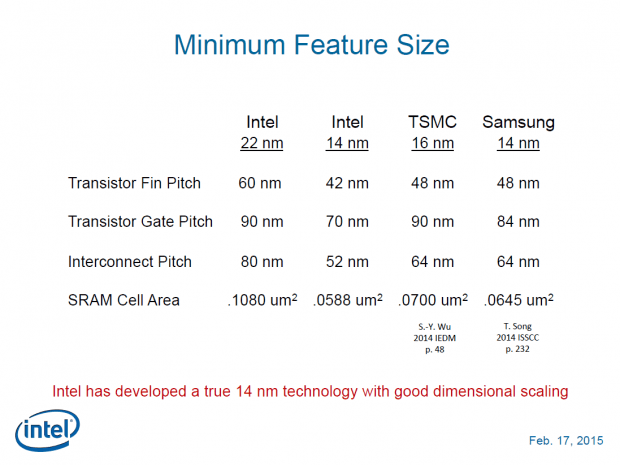Um eine generelle Vorstellung von den Strukturgrößen zu bekommen reicht die Grafik zwar schon aus, aber der Vollständigkeit halber sollte man auch dazu erwähnen, dass die Angaben sich hier bei TSMC auf den 16FF-Prozess und bei Samsung auf den 14nm LPE-Prozess beziehen. Aktuell stehen bei TSMC und Samsung verbesserte 16nm/14nm Prozesse für die Massenproduktion bereit, die näher an Intels 14nm Prozess herankommen.