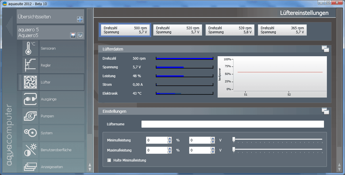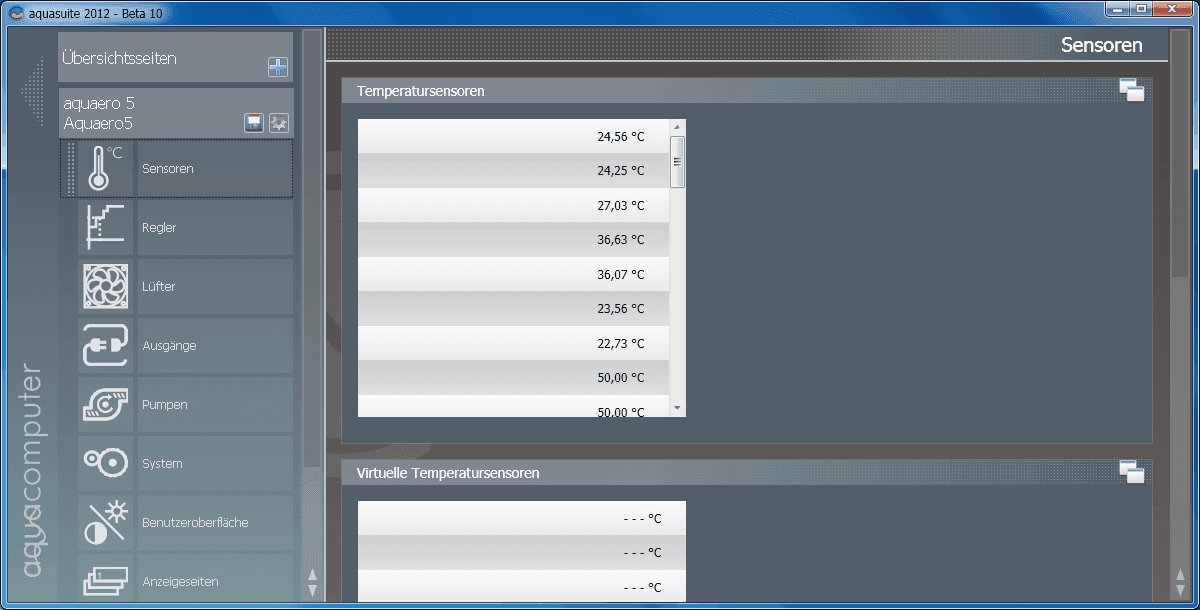 Ich habe mit den gleiche Problem zu kämpfen. Die Drehzahlen der Lüfter werden zwar gelesen aber ansonsten scheint das aquero mit der Aquasuite weder in die eine noch in die andere richtung zu kommunizieren.