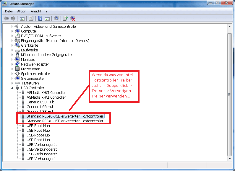 Auf die Intel USB Hostcontroller gehen und auf vorherigen Treiber zurückgehen um den Windowseigenen Treiber zu nehmen. (Siehe screenshot)