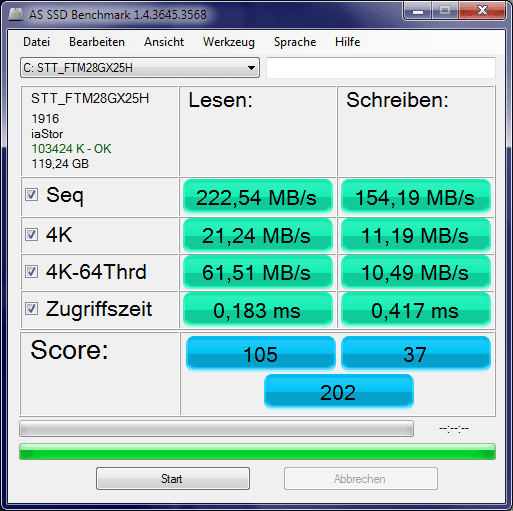 Fehlende Treiber? Da andere Treiber außer die Windows-eigenen den TRIM-Befehl nicht weitergeben, muss ich zwangsweise mit diesen Treibern leben (was ich auch gut kann). Als ich auf AHCI umgestellt habe, stand im Benchmarkfenster auch dementsprechend MSAHCI anstatt PCIIDE, das dürfte also richtig sein.