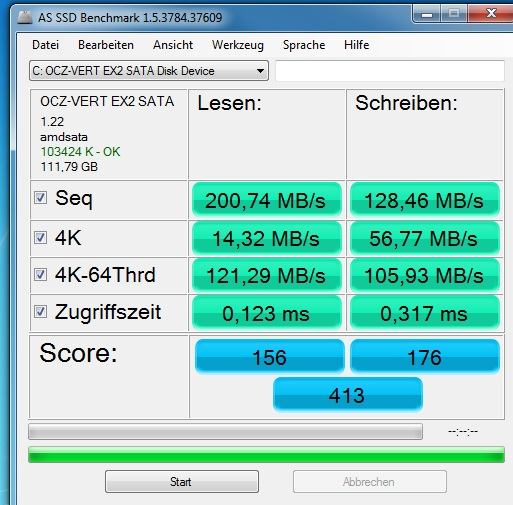 Normalerweise fällt das nicht weiter auf, weil der Controller die Daten in seinen Cache zwischenspeichert, und dem Programm/Betriebssystem schon mal "fertig" meldet, und die eigentlichen Schreibvorgänge erst danach ausführt. Doch irgendwann ist der Cache halt voll und der Controller muss die alten Vorgänge erst abarbeiten, bevor er neue Daten entgegennehmen kann. Da bricht der Bench dann auf die "reale" Geschwindigkeit ein.