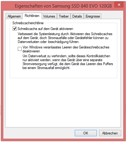 Und die ist die Einstellung zum Schreibcache? Du hast ja einen X79, also einen Abkömling der Enterprise Plattform, da könnte im BIOS der Schreibcache der LW deaktiviert sein, dass ist bei Enterprise wegen der Datensicherheit nicht soungewöhnlich, siehe mein Beispiel des kleinen HP N54L.