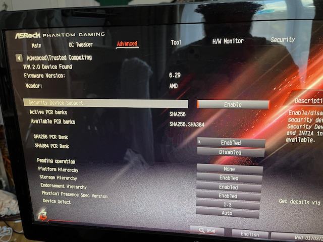 1) Unter dem Reiter "Advanced" gibt es die Option "Security Device Support". Das steht derzeit auf "Enabled" --> das könnte ich deaktivieren