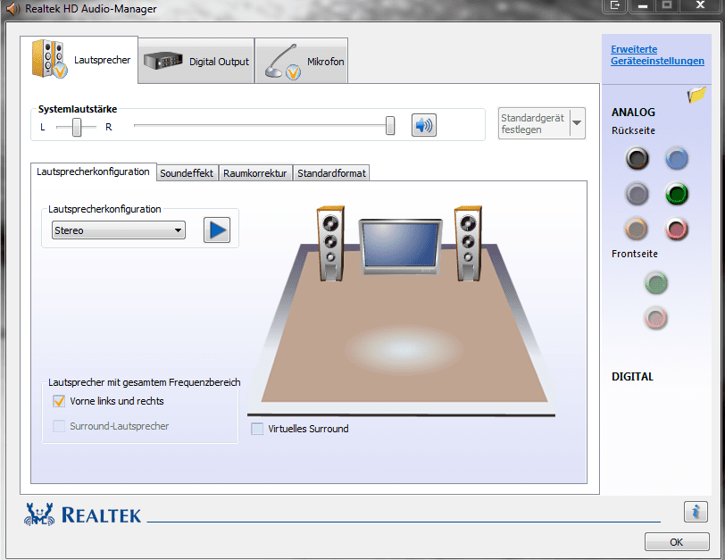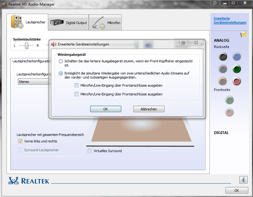 unter dem soundmanager vom realtek konnte ich alle aus und eingänge frei definieren, also konnte wild anstecken und dann sagen: