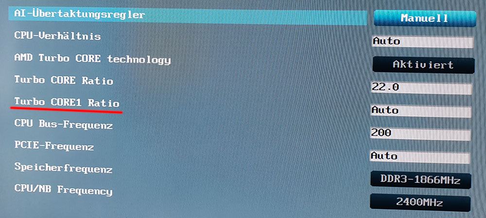 Jetzt ist mir aber zusätzlich aufgefallen, dass es da noch einen Eintrag >Turbo CORE1 Ratio< gibt - was ist das?