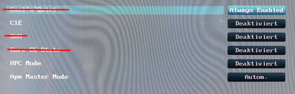 ich habe mich gewundert, warum mein CPU-Temp. nicht wie gewöhnlich im Leerlauf herunter ging - Cool & Quiet war aus, bzw. der Eintrag (nicht nur der) im Bios fehlte vollkommen. Wie kann das sein?